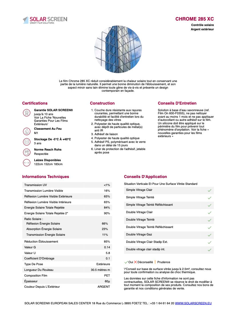 Le film solaire CHROME 285 XC en pose extérieure, d'une largeur de 0,91 mètre, offre une protection efficace contre la chaleur et l’éblouissement grâce à sa teinte argentée. Conçu pour une installation extérieure, il améliore le confort thermique tout en préservant la visibilité. Sa durabilité en fait une solution adaptée pour réduire l’impact des rayons solaires sur vos vitrages, contribuant ainsi à une meilleure gestion énergétique de vos espaces.
